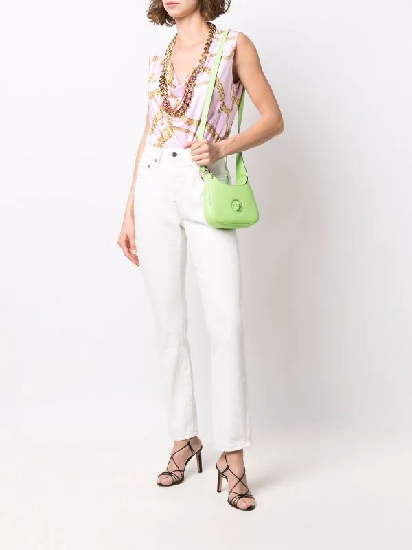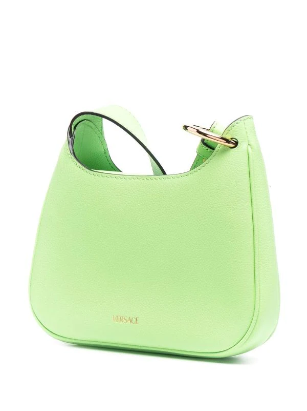 Texture grainée, détail Medusa, logo imprimé à l’arrière, finitions en métal doré, bride porté épaule ajustable, compartiment principal, poche intérieure plaquée. Couleur : vert. Matière : cuir de veau.