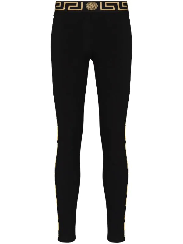 Legging à bandes Grecca en coton mélangé Versace avec taille normale, ceinture élastique, empiècements à coutures visibles, coupe stretch et coupe longue. Couleur : noir.
