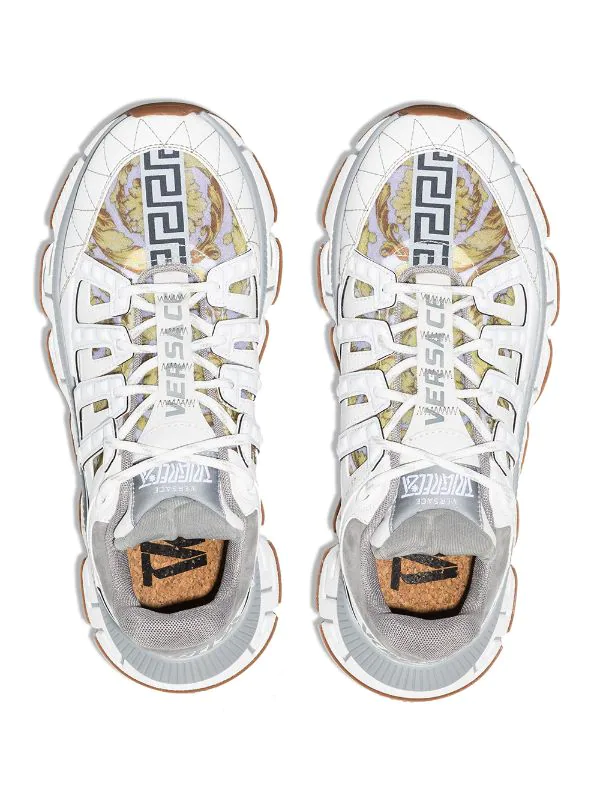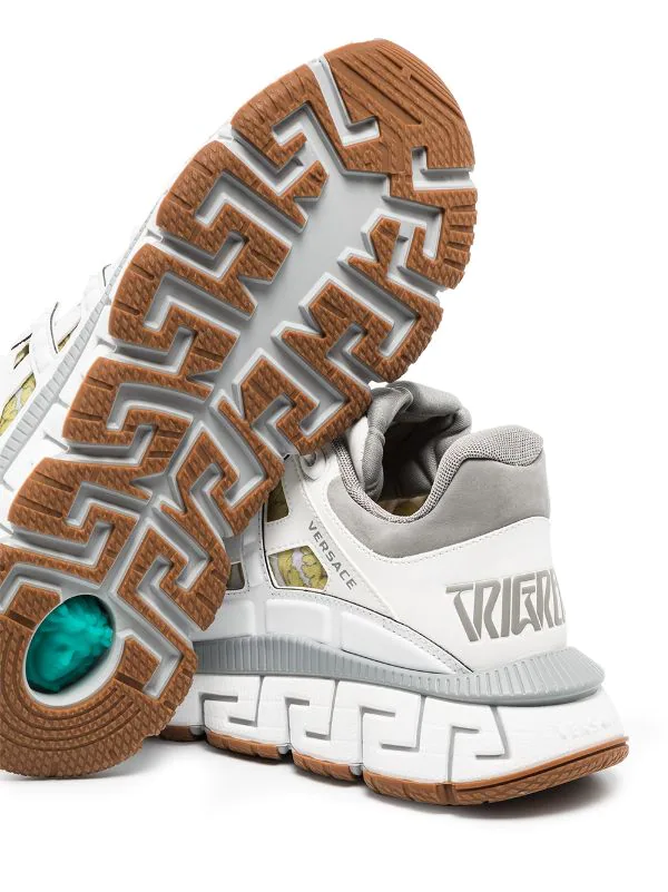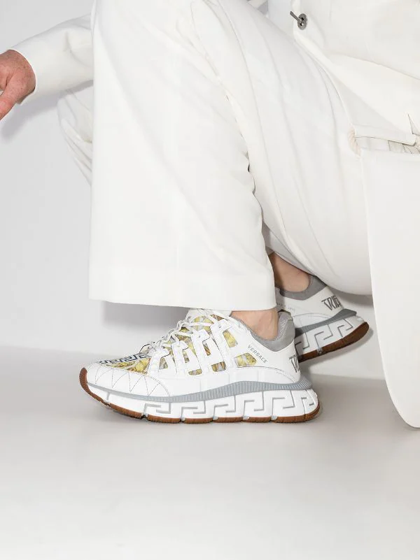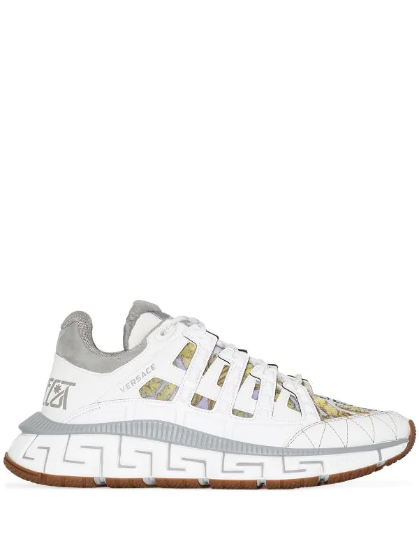 Design à empiècements, détail Greca signature, logo imprimé sur le côté, languette à patch logo, bout rond, fermeture à lacer sur le devant, semelle intérieure à logo, semelle épaisse en caoutchouc. Couleur : blanc. Matière : cuir.