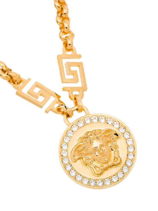 Ornement en cristal, détail Medusa, détail Greca signature, maille jaseron, fermoir mousqueton, chaîne à longueur ajustable.