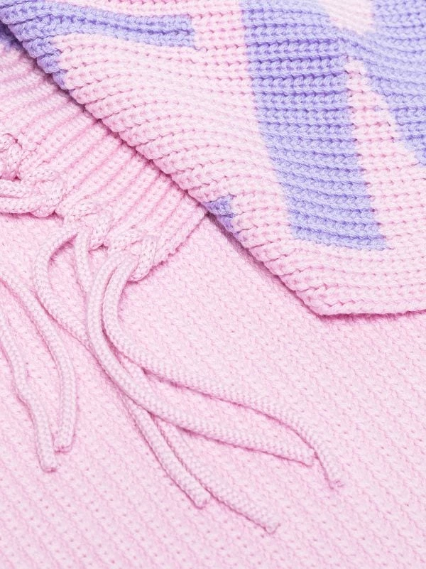 Logo intarsia, maille épaisse, bordures à pompons. Matière : laine.