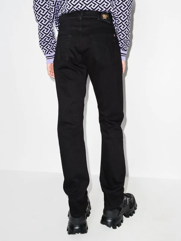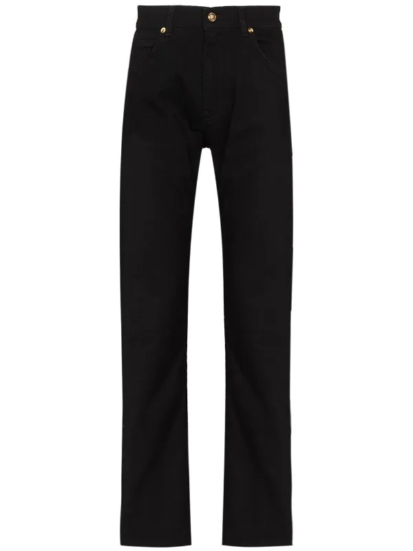 Détail Medusa, passants de ceinture, fermeture à zip et boutons sur le devant, cinq poches classiques. Couleur : noir.