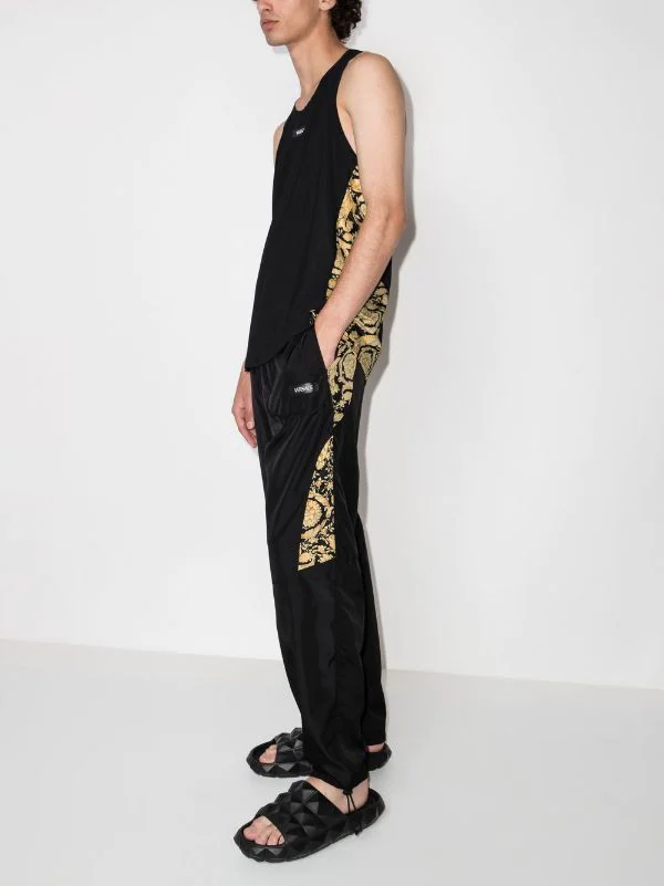 Noir, doré, ceinture élastique, motif baroque, poches latérales fendues, patch logo sur le devant, coupe droite, ourlet à lien de resserrage.