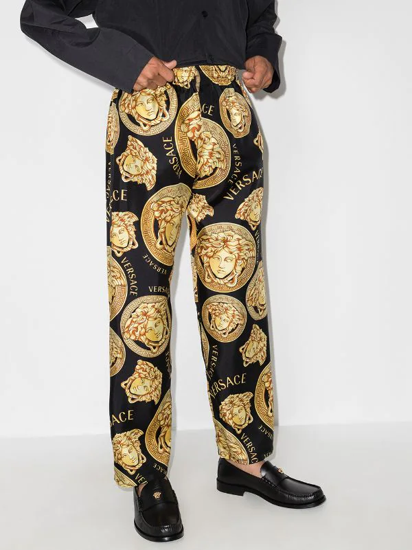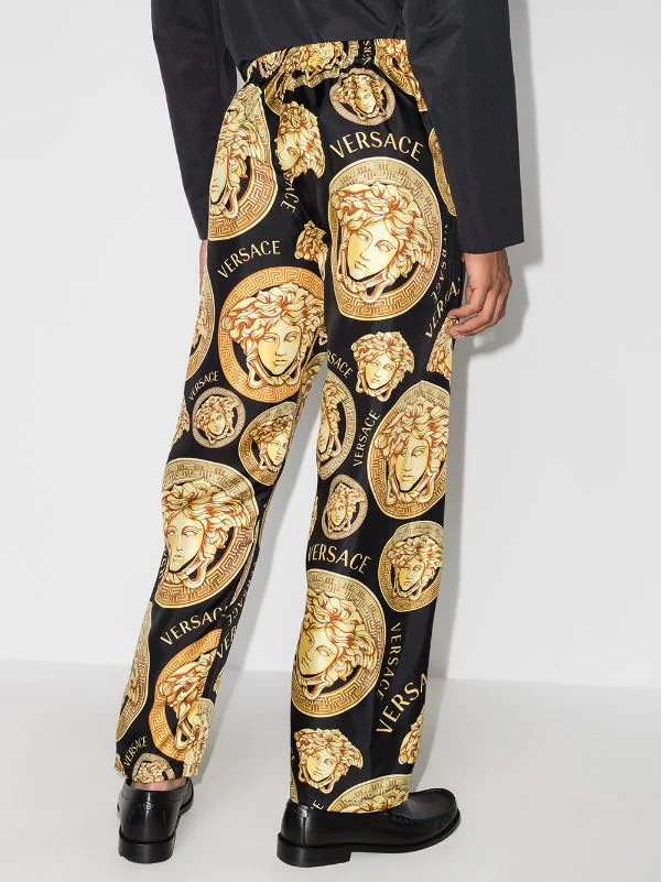 Motif Medusa, taille haute, ceinture élastique, coupe droite. Matière : soie.