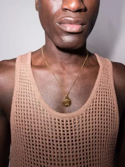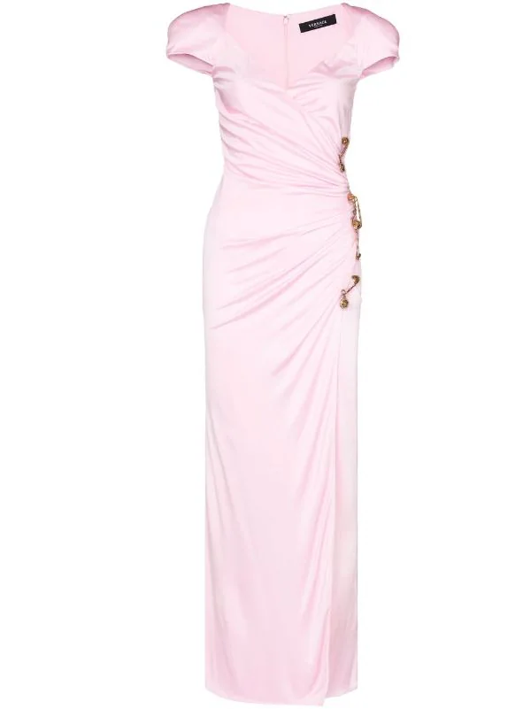 Détail d’épingle Medusa signature, détail drapé, col v, fermeture zippée dissimulée à l’arrière, manches courtes, fente sur le devant, longueur maxi. Couleur : rose.
