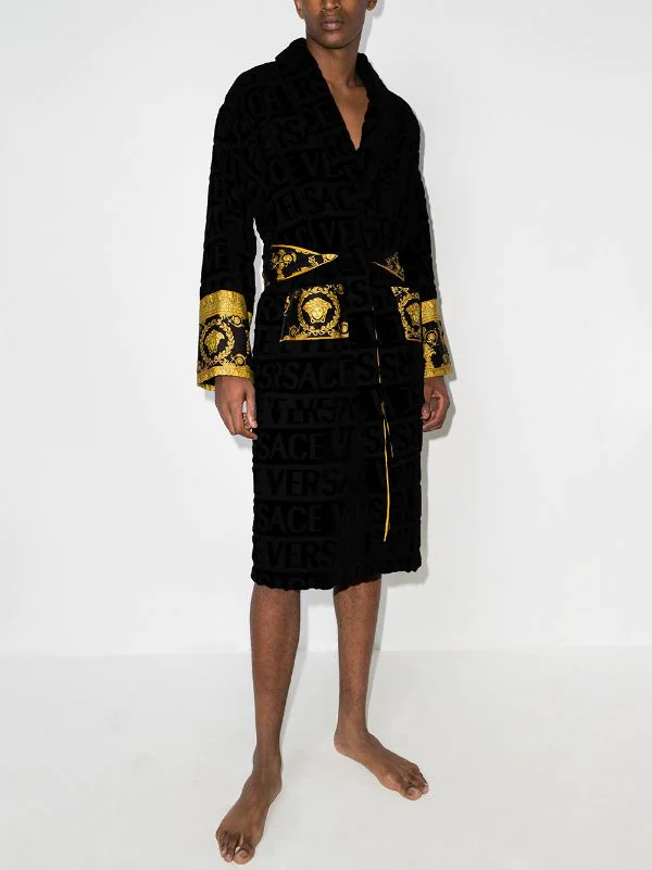 Imprimé monogrammé, imprimé Barocco signature, col châle, taille ceinturée, manches longues, deux poches latérales plaquées, ourlet droit, coupe mi-longue. Couleur : noir. Matière : coton.