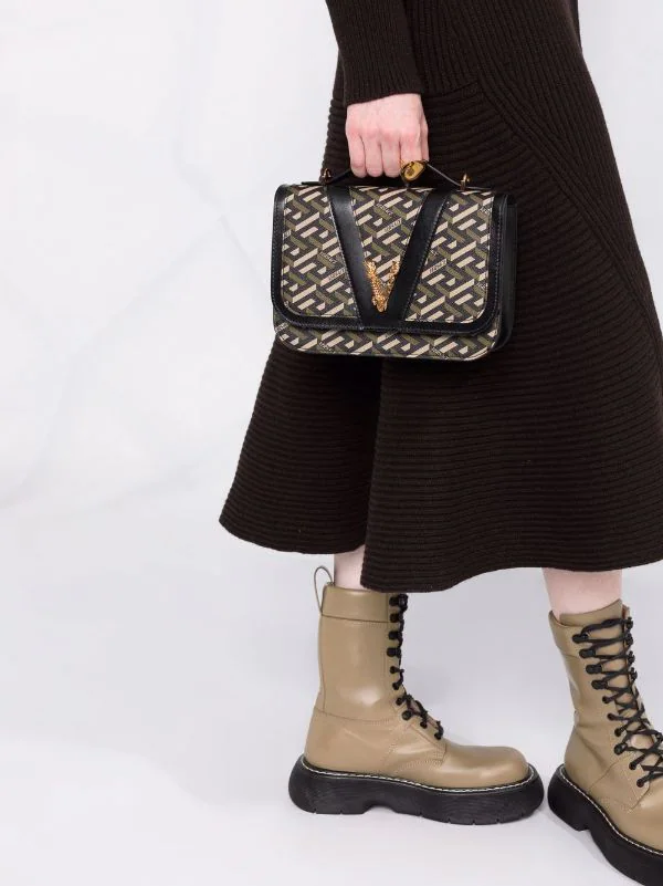 Détail de logo Virtus signature, design à empiècements, motif Greca signature imprimé, plaque logo dorée, compartiment principal, poche intérieure zippée, rabat sur le dessus à fermeture magnétique, anse plate sur le dessus, bride porté épaule en chaîne détachable.