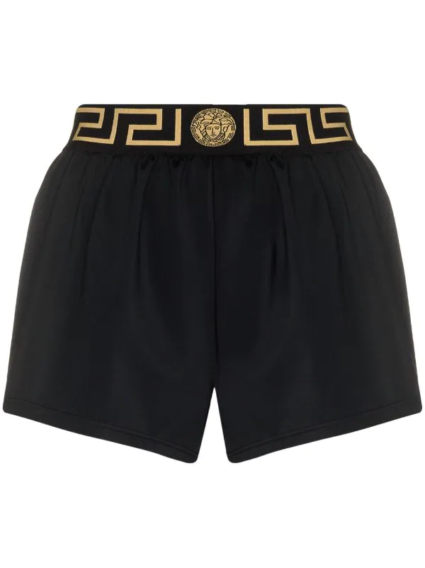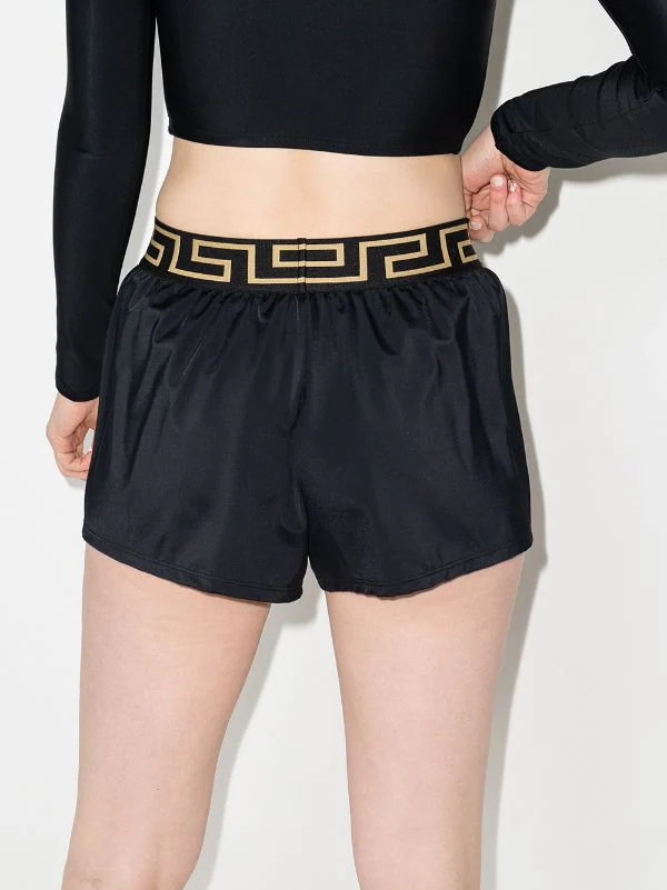 Détail Greca signature, ceinture élastique, coupe courte. Couleur : noir.
