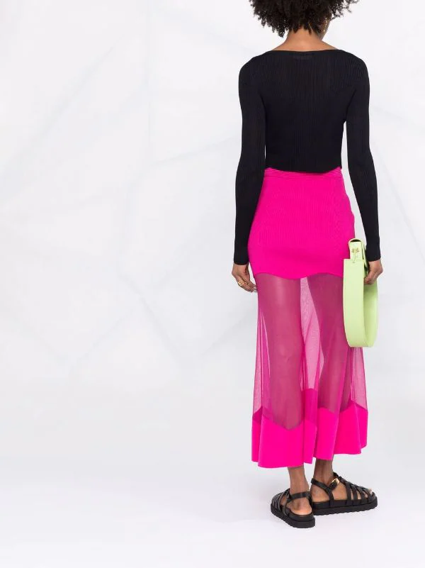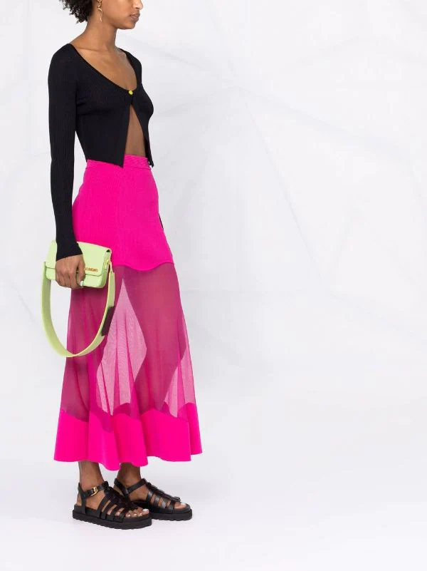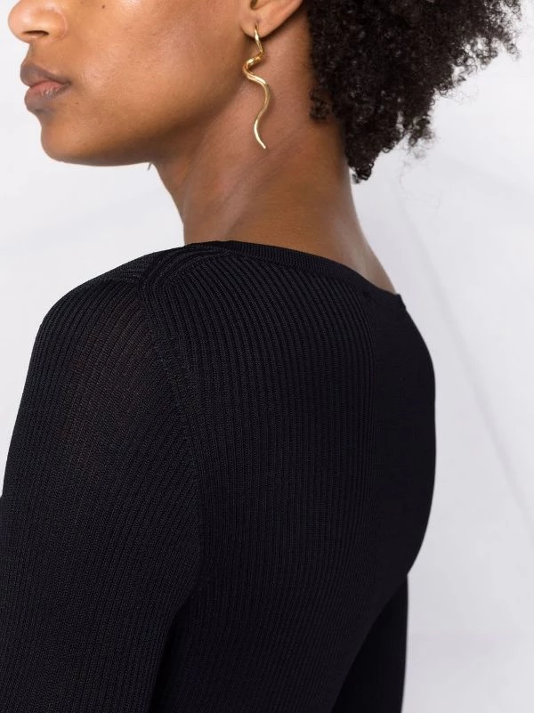 Noir, maille nervurée, encolure arrondie, bouton unique au dos, devant ouvert, manches longues, coupe courte.