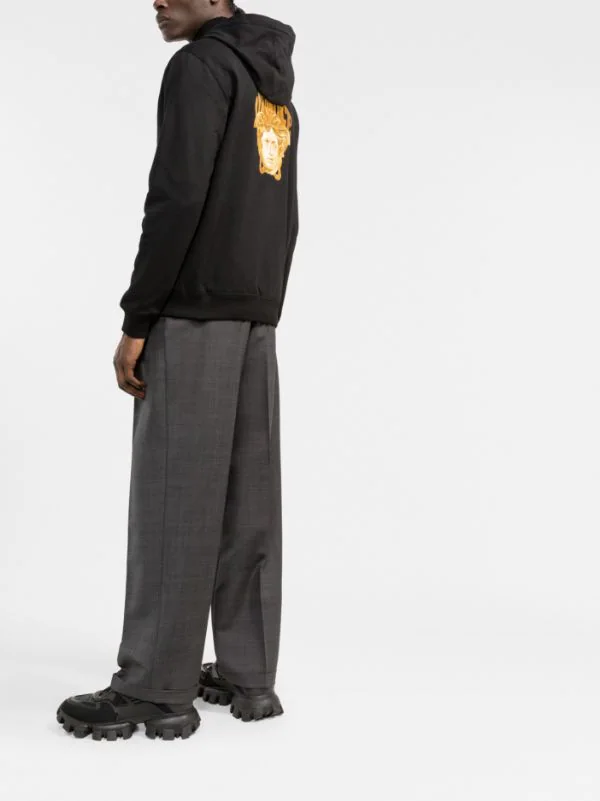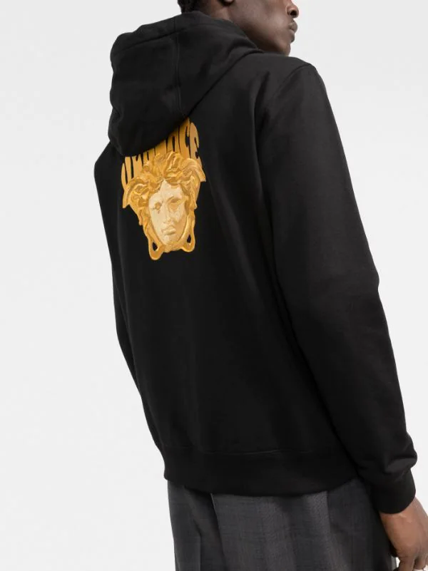 Logo brodé sur la poitrine, motif Medusa, capuche à lien de resserrage, fermeture zippée devant, manches longues, poignets élastiqués, poches latérales kangourou, ourlet élastiqué. Matière : coton.