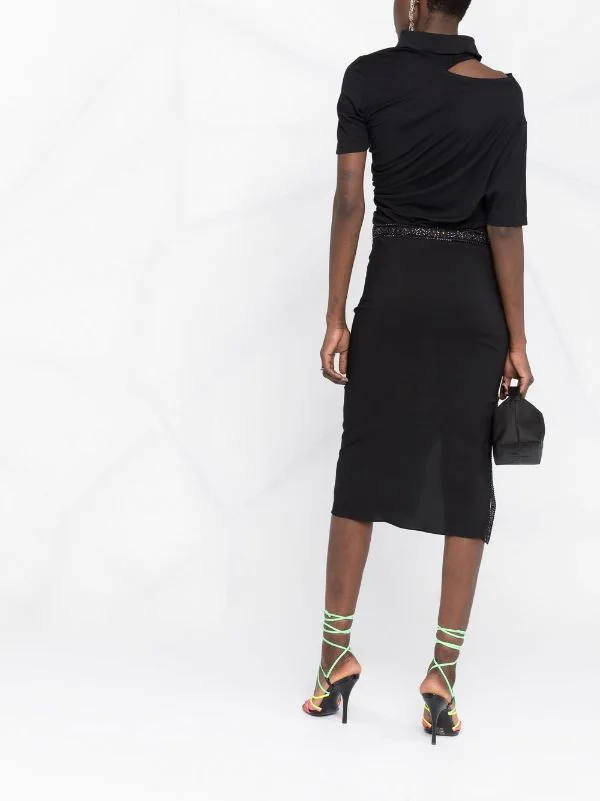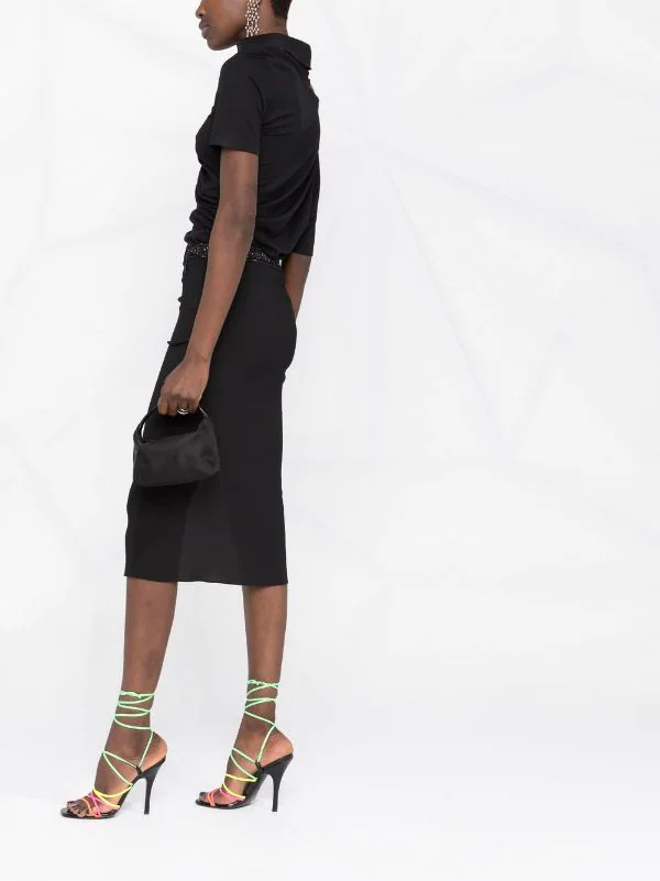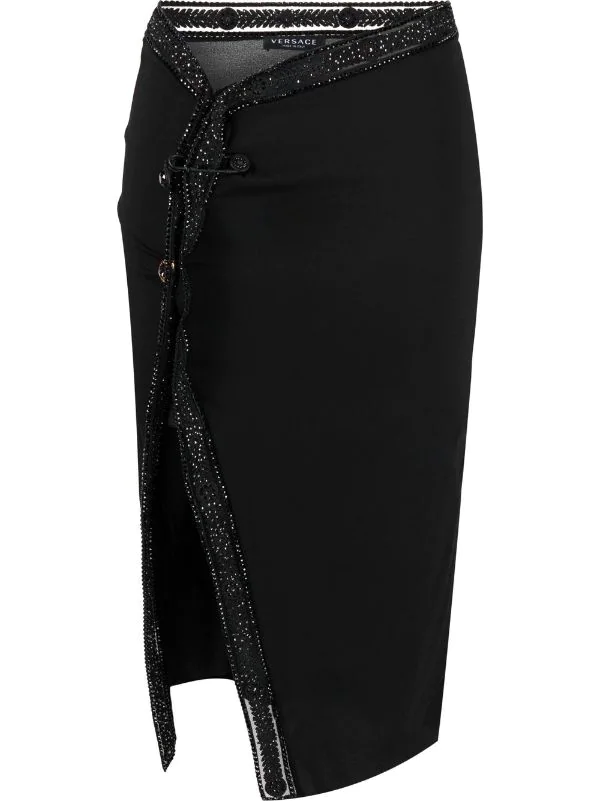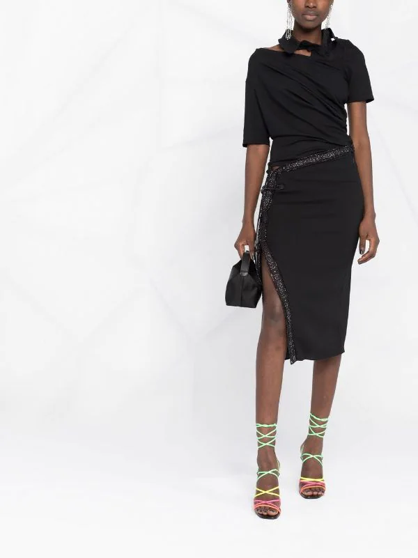 Noir de jais, ornement en cristal, détail d’épingle à nourrice, fente sur le devant, taille haute.