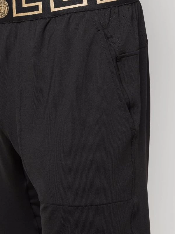 Détail Greca signature, ceinture à logo, construction stretch, deux poches latérales fendues, chevilles élastiques.
