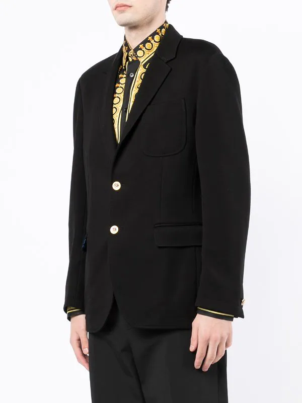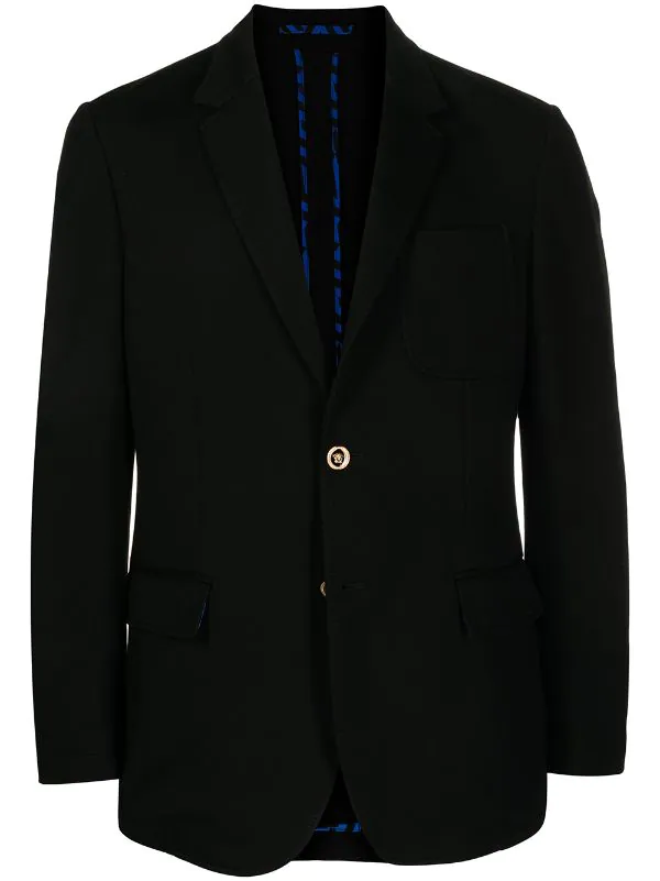 Revers crantés, poche poitrine plaquée, boutonnière sur le devant, manches longues, deux poches à rabat sur le devant. Couleur : noir.