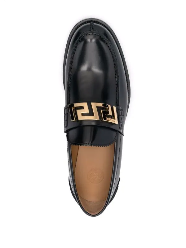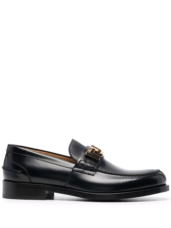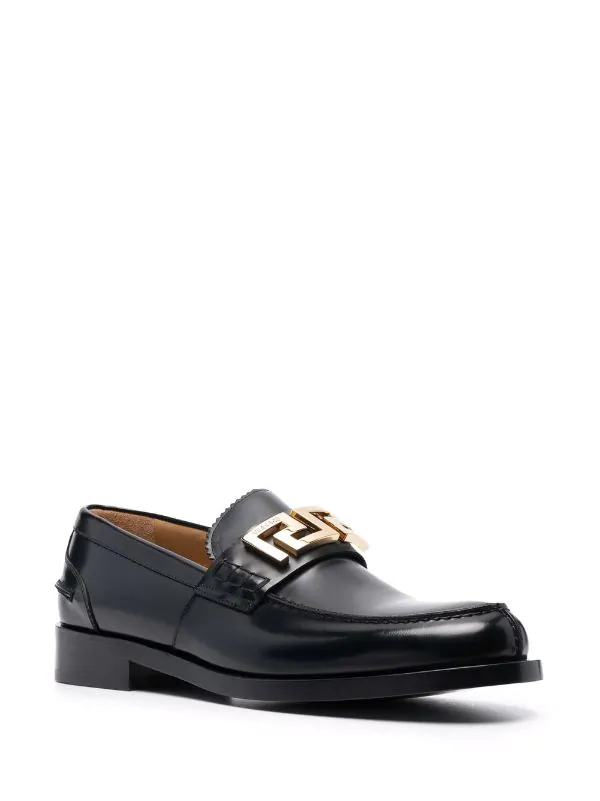 Détail Greca signature, design à enfiler, fini poli, bout rond. Couleur : noir. Matière : cuir.