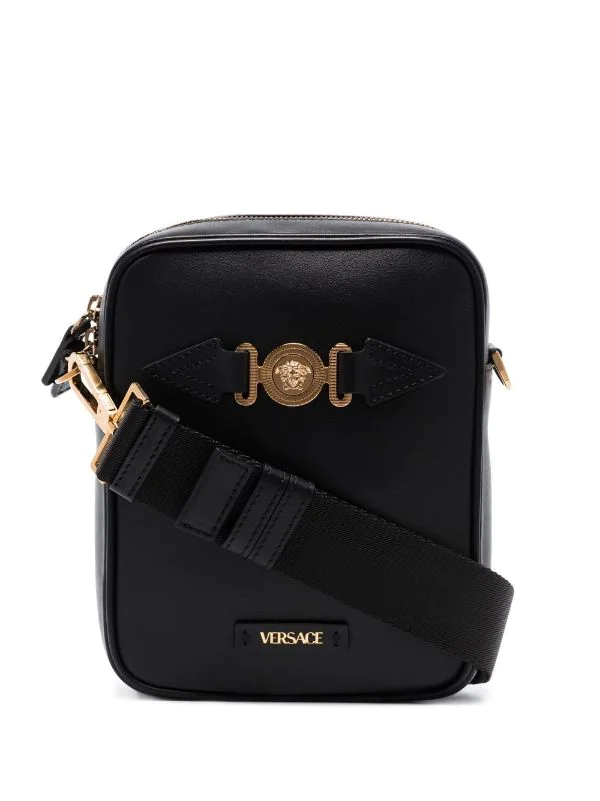 Motif Medusa, fermeture zippée sur le dessus, compartiment principal, finitions en métal doré. Matière : cuir.