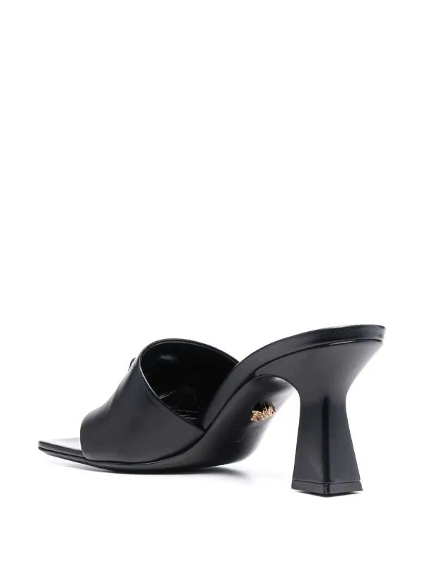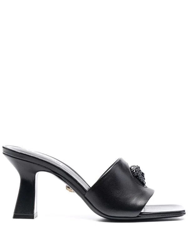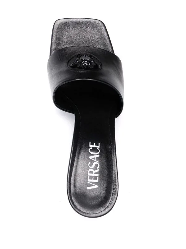 Doublure en cuir, motif Medusa, bout ouvert, design à enfiler, semelle intérieure à logo, talon haut épais. Matière : cuir de veau.