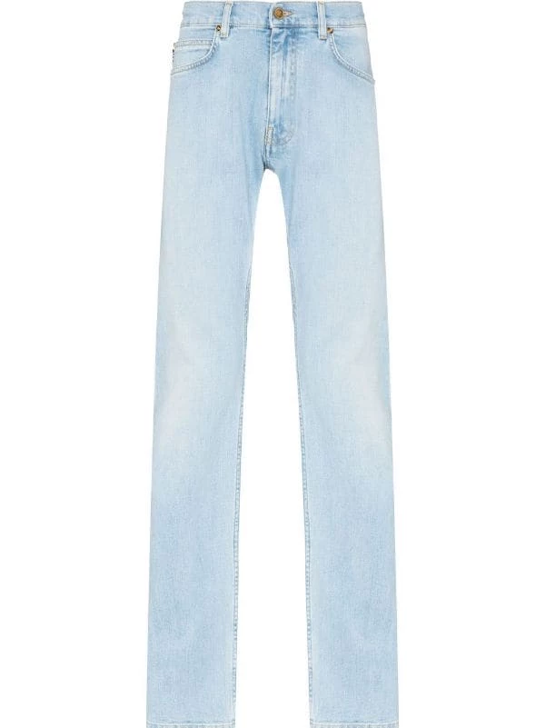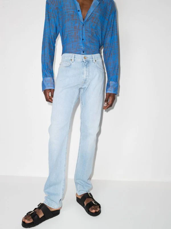 Bleu clair, coton stretch, effet légèrement délavé, motif Medusa, patch logo sur le devant, taille basse, passants de ceinture, fermeture à zip et boutons sur le devant, cinq poches classiques, coupe slim, coupe droite.