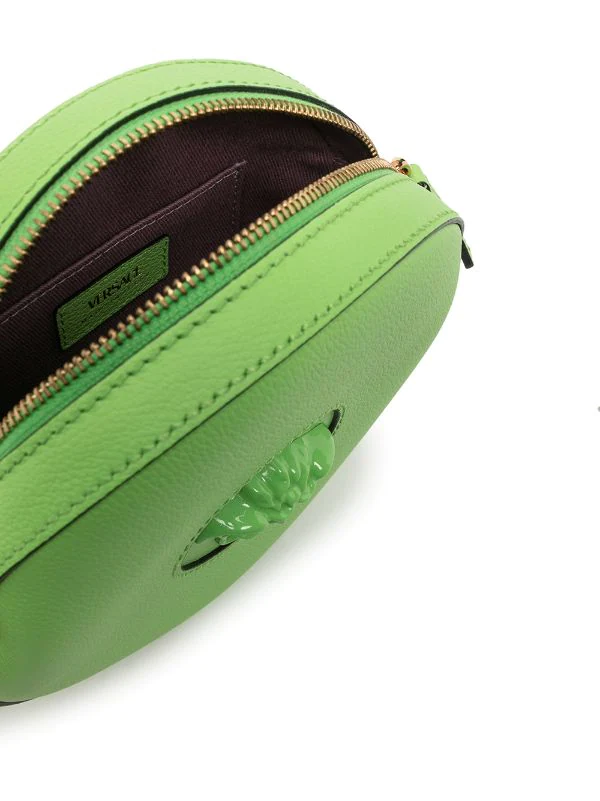 Texture grainée, design ton sur ton, motif Medusa, finitions en métal doré, bride porté épaule détachable et ajustable, fermeture zippée sur le dessus, compartiment principal, poche intérieure plaquée. Couleur : vert. Matière : cuir.