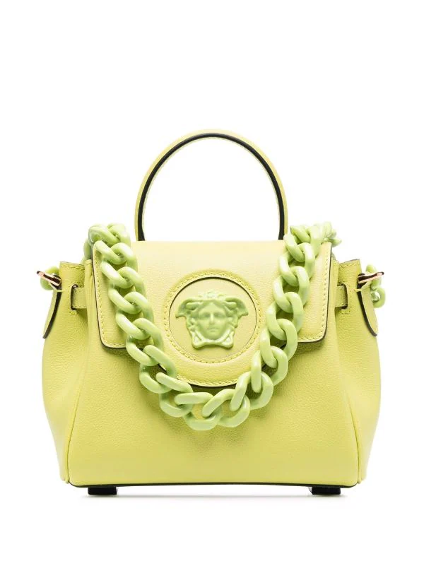Motif Medusa, rabat sur le dessus, bride porté épaule en chaîne détachable, anse arrondie.