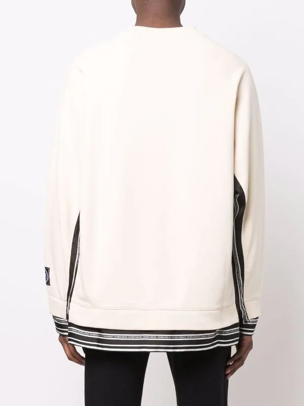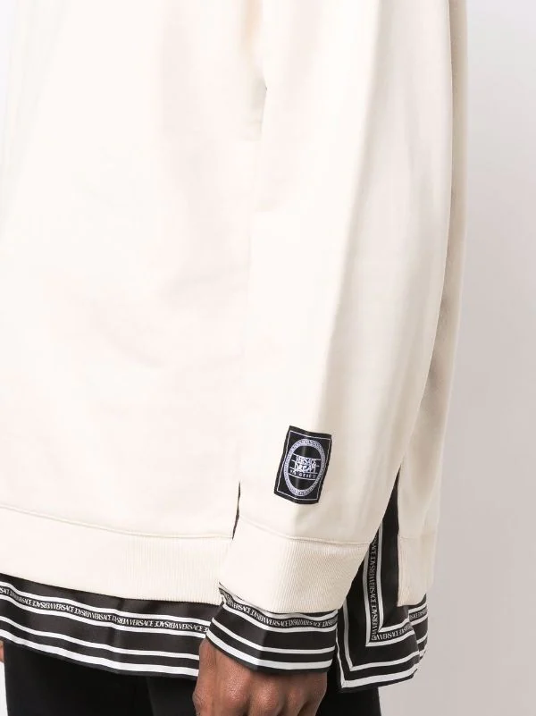 Encolure ronde, bord en maille côtelée, ourlet droit, épaules tombantes, manches longues raglan, patch logo sur la manche.
