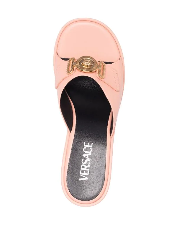 Rose clair, cuir, détail Medusa, semelle intérieure griffée, finitions en métal doré, bout ouvert, design à enfiler, talon mi-haut.
