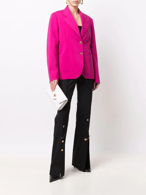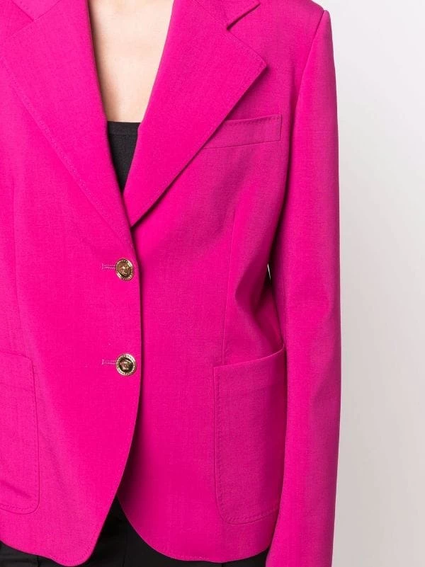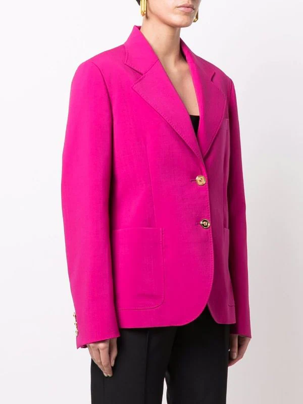 Revers classiques, fermeture boutonnée, manches longues, deux poches latérales plaquées. Couleur : rose.