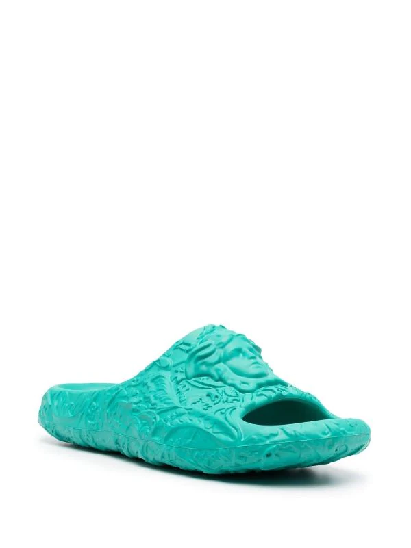 Design à enfiler, bout ouvert, détail Medusa, imprimé Barocco signature, semelle intérieure à logo, semelle plate en caoutchouc.