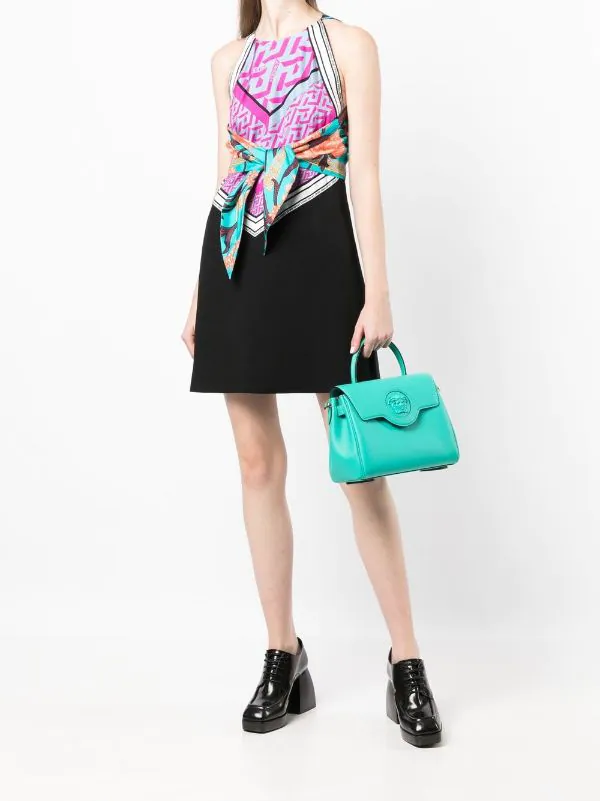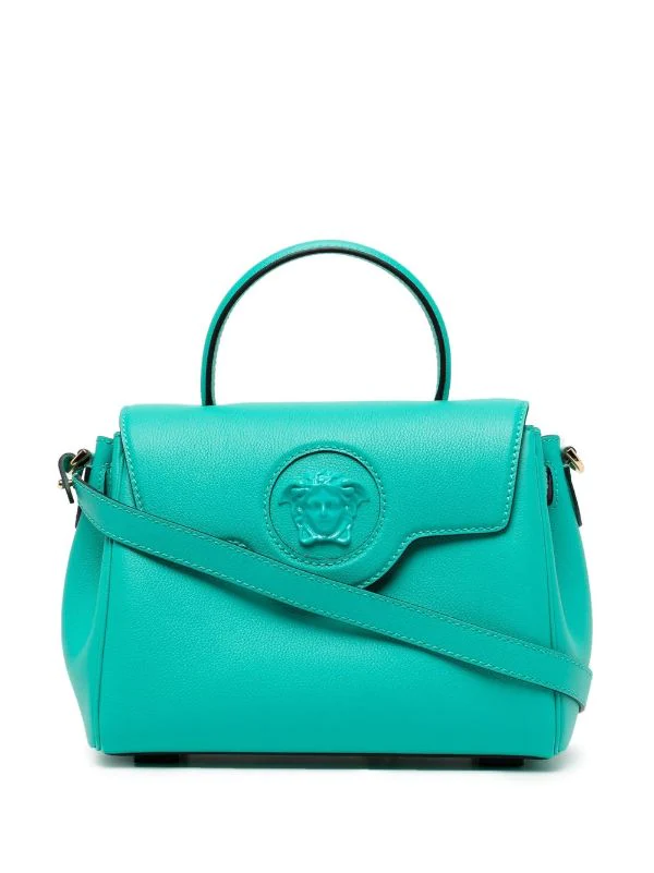 Détail Medusa, anse classique, bride porté épaule en chaîne, rabat sur le dessus, compartiment principal, poche intérieure zippée. Couleur : vert. Matière : cuir.