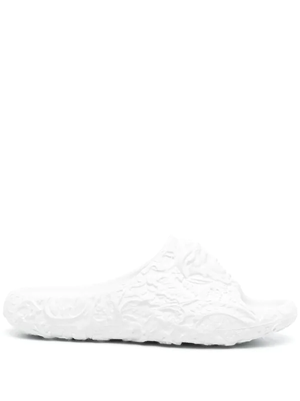 Design à enfiler, détail Medusa, bout ouvert, semelle plate en caoutchouc.