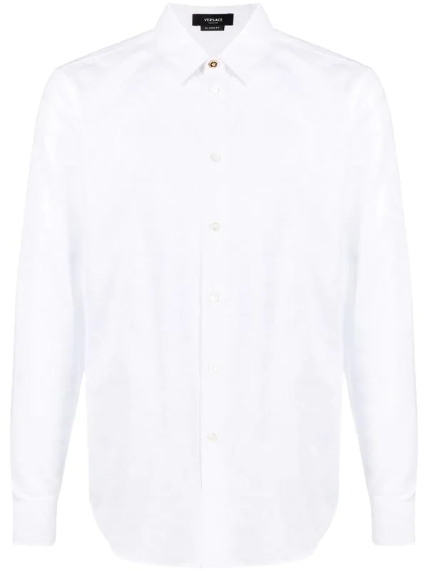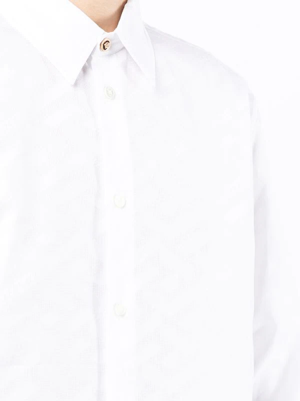 Jacquard à motif logo, détail Greca signature, manches longues, poignets boutonnés, col pointu plat, ourlet incurvé, boutonnière sur le devant. Couleur : blanc. Matière : coton.