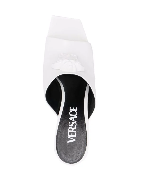 Motif Medusa, bout ouvert, bout carré, design à enfiler, semelle intérieure à logo, talon haut, semelle à plateforme, semelle en cuir. Couleur : blanc. Matière : cuir.