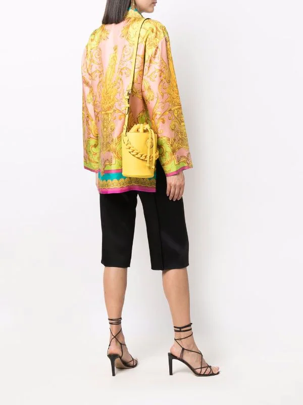 Forme seau structurée, finitions en métal doré, motif Medusa, détails de chaînes, bride porté épaule ajustable, fermeture à lien de resserrage, poche intérieure plaquée, doublure en toile. Couleur : jaune. Matière : cuir.