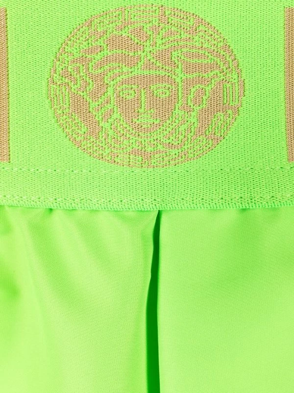 Détail Greca signature, motif Medusa, ceinture élastique, coupe droite. Veillez à essayer les maillot de bain par-dessus vos propres sous-vêtements.