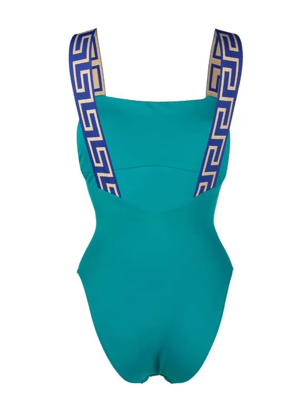 Détail Greca signature, encolure carrée, bretelles larges. Veillez à essayer les maillot de bain par-dessus vos propres sous-vêtements.