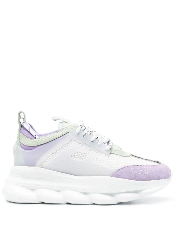 Lavande, blanc cassé, cuir, design à empiècements, languette à patch logo, bout rond, fermeture à lacer sur le devant, semelle intérieure à logo, semelle plate en caoutchouc.