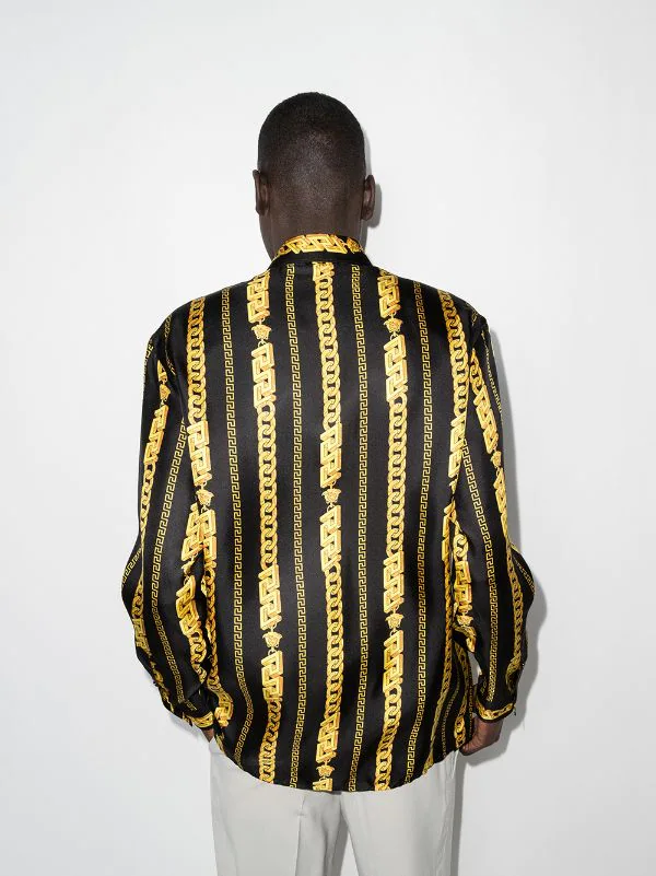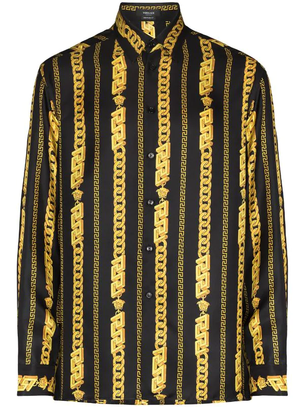 Motif Greca signature imprimé, motif Medusa, imprimé chaîne, col classique, boutonnière sur le devant, manches longues, poignets boutonnés, ourlet droit. Matière : soie.