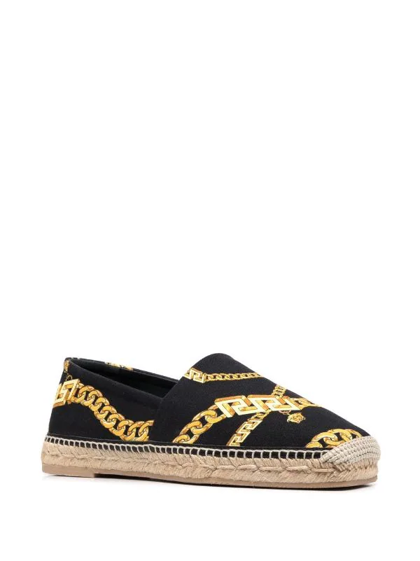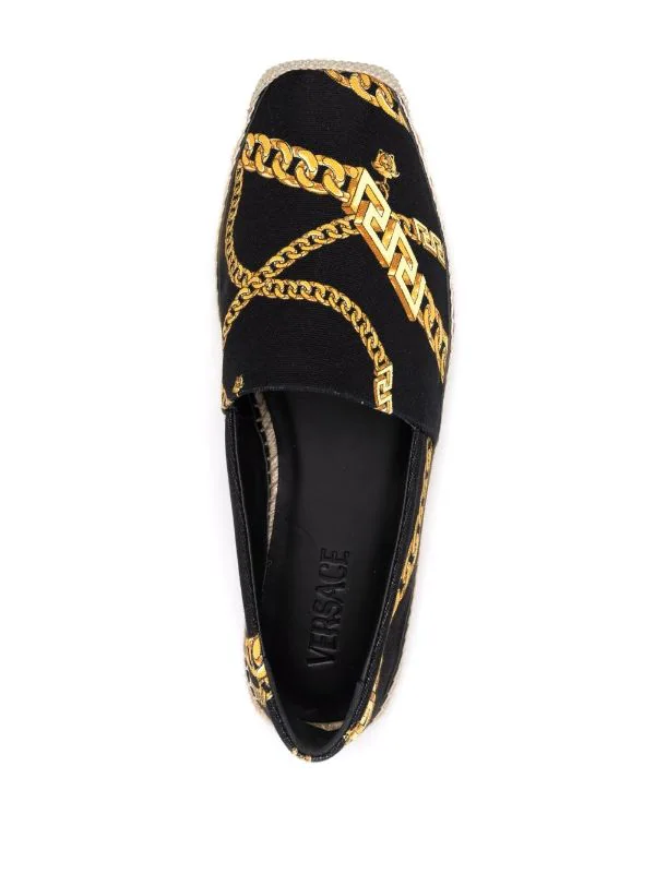 Imprimé chaîne, motif Greca signature imprimé, bout carré, design à enfiler, semelle en raphia tressé.