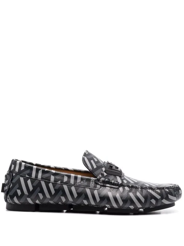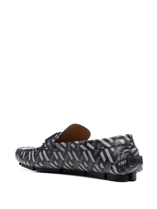 Bout en amande, imprimé La Greca signature, détail Greca signature, semelle intérieure à logo, plaque logo, semelle à détails de clous. Couleur : noir. Matière : cuir.