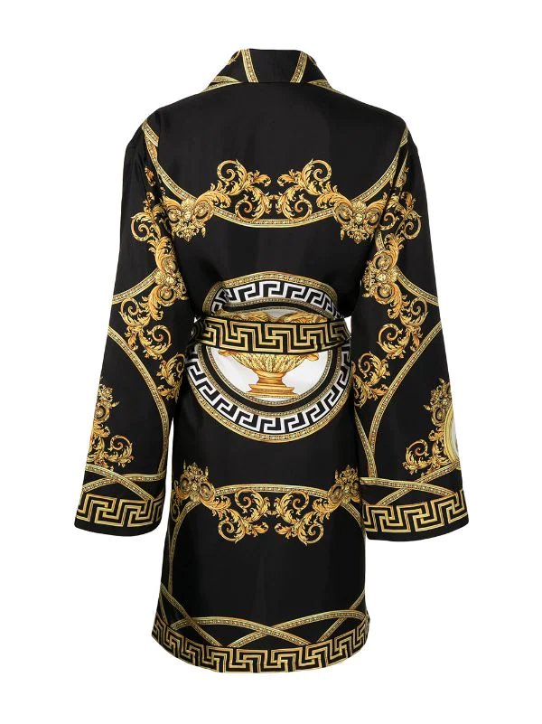 Imprimé La Greca signature, motif Medusa, col châle, taille nouée, manches longues, deux poches plaquées avant, hauteur genou. Matière : soie.