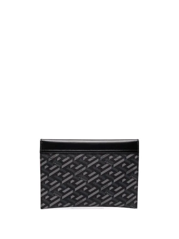 Imprimé La Greca signature, style enveloppe, rabat sur le devant, fermeture à boutons pression, compartiment principal. Matière : cuir de veau.