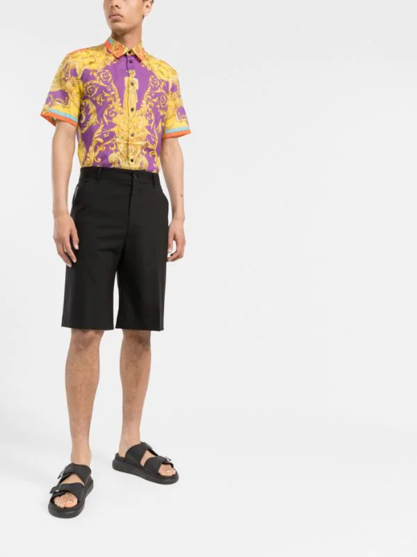 Col pointu plat, boutonnière sur le devant, manches courtes, ourlet incurvé, imprimé Barocco signature. Couleur : multicolore. Matière : coton.