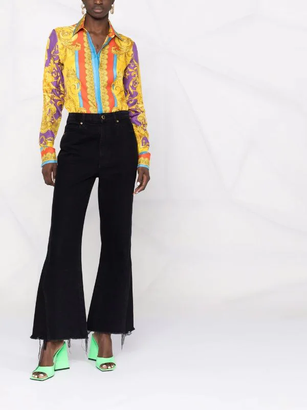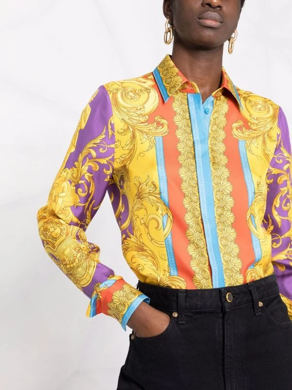 Motif baroque, col classique, boutonnière sur le devant, poignets boutonnés, ourlet droit. Couleur : multicolore. Matière : soie.