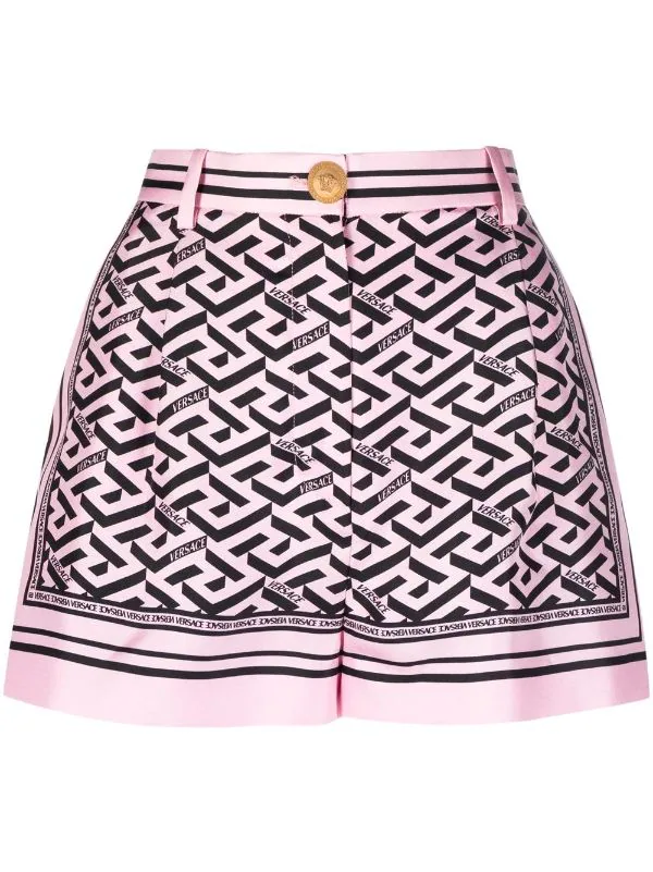 Motif Greca signature imprimé, taille haute, passants de ceinture, fermeture à zip et boutons sur le devant, deux poches latérales fendues, poche arrière passepoilée. Matière : soie.