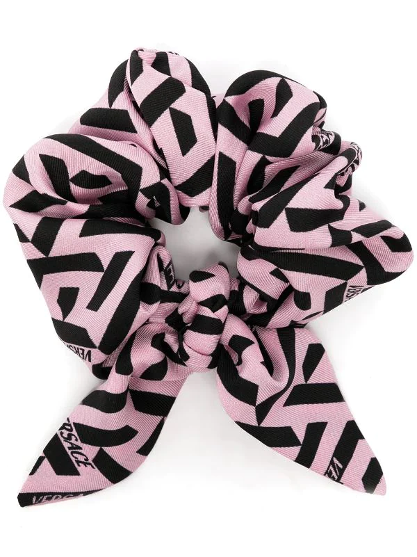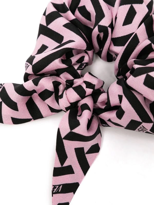 Motif Greca signature imprimé, imprimé monogrammé, détail de nœud. Matière : soie.