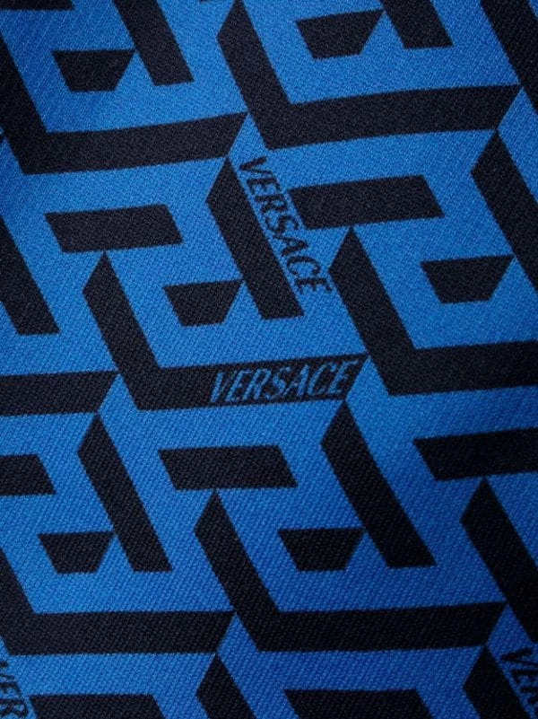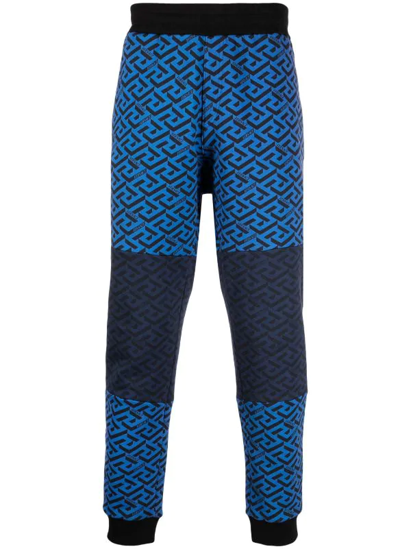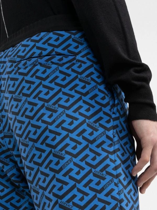Imprimé La Greca signature, design à empiècements colour block, ceinture élastique, deux poches latérales fendues, poche arrière passepoilée, coupe slim, poignets élastiqués. Couleur : bleu. Matière : coton.