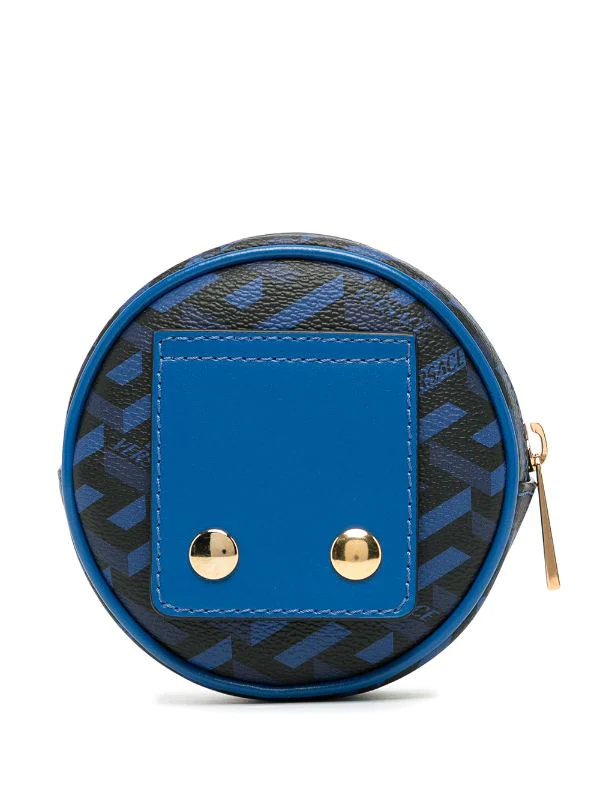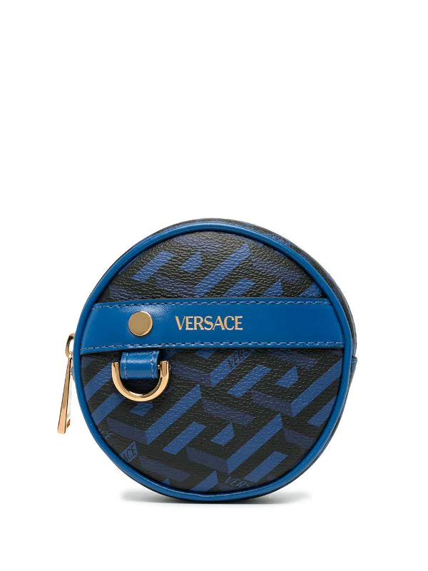 Logo doré, design à empiècements, fermeture zippée sur le dessus, passants de ceinture, porte-clés pendant. Couleur : bleu. Matière : cuir.