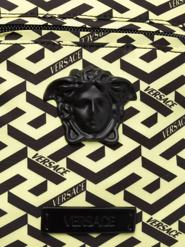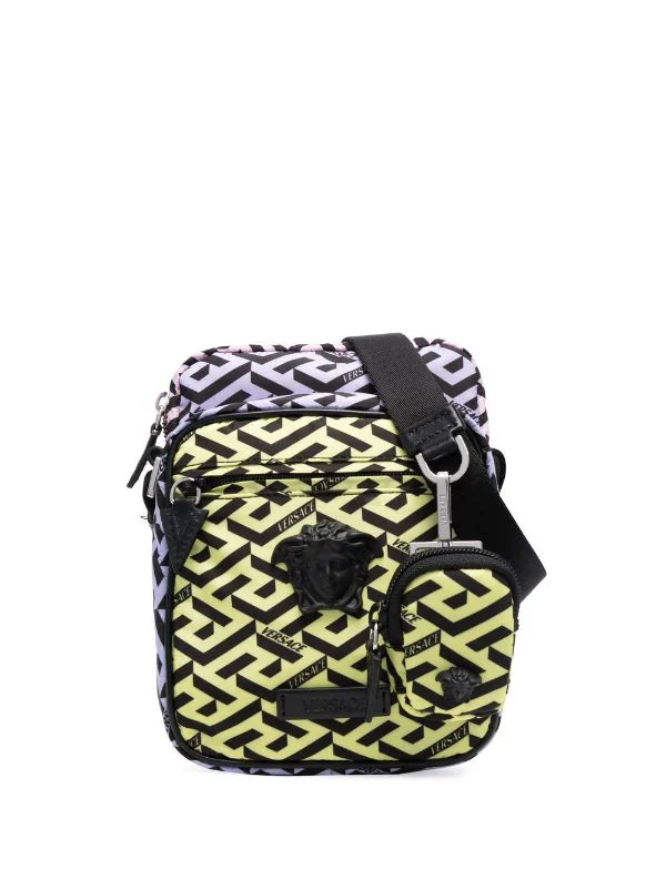Motif géométrique, patch logo sur le devant, motif Medusa, poche zippée sur le devant, fermeture zippée sur le dessus, compartiment principal, bride porté épaule ajustable. Matière : cuir de veau.