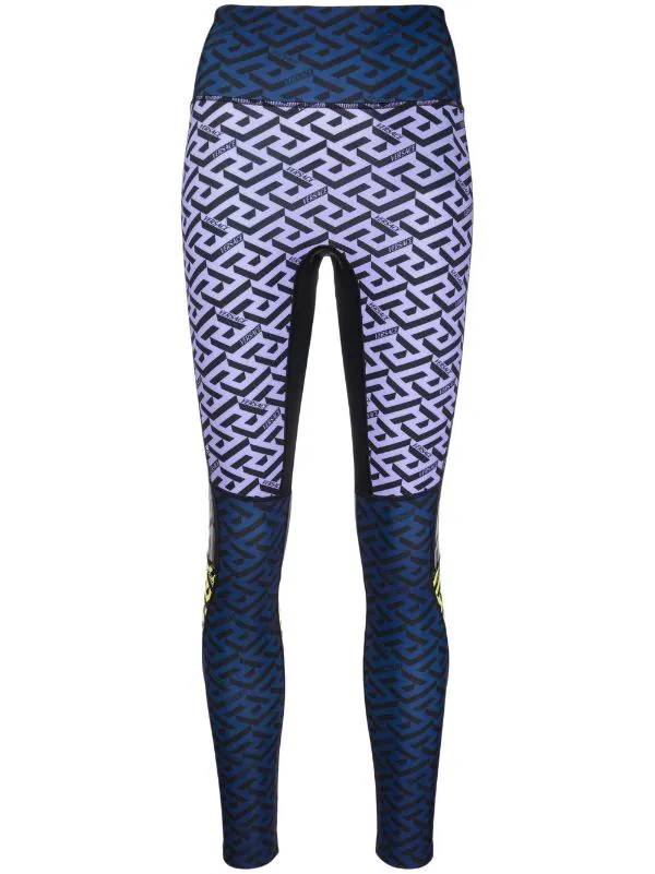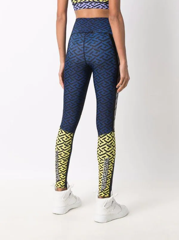 Construction stretch, design colour block, motif Greca signature imprimé, taille haute, coupe super skinny, hauteur cheville.