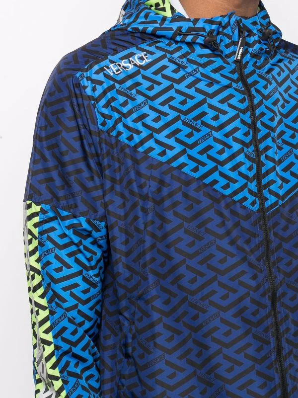 Design colour block, imprimé La Greca signature, capuche classique, col montant, fermeture zippée devant, logo imprimé à la poitrine, manches longues, poignets élastiqués. Couleur : bleu.