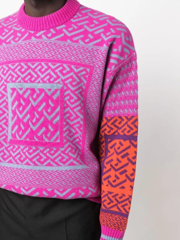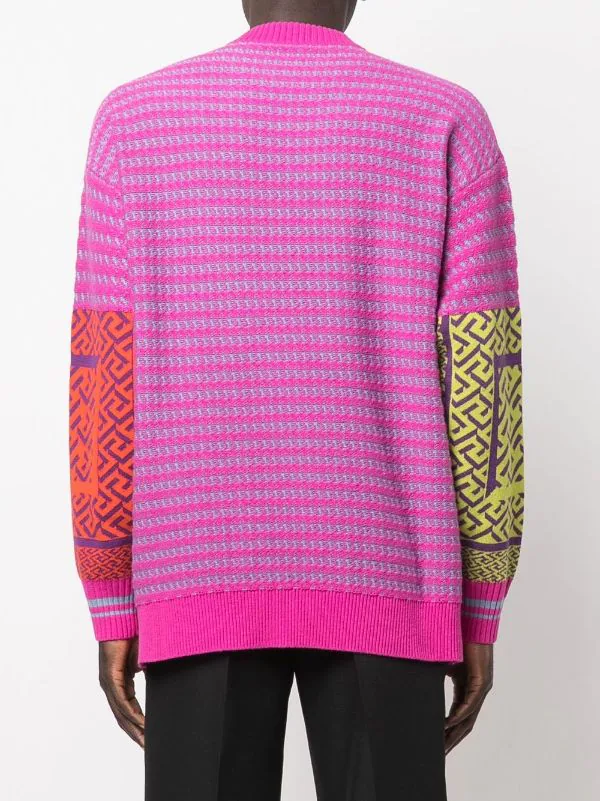 Imprimé La Greca signature, maille intarsia, encolure ras du cou, manches longues, poignets nervurés, ourlet nervuré.